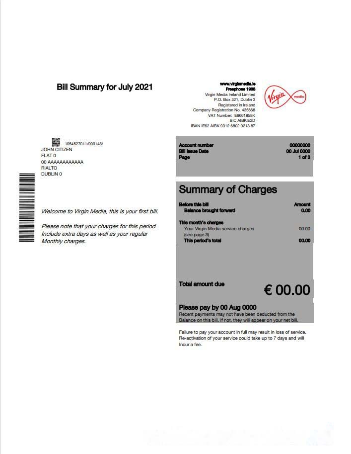 Ireland Virgin Media utility bill template editable in Word and PDF, version 1 download template file
