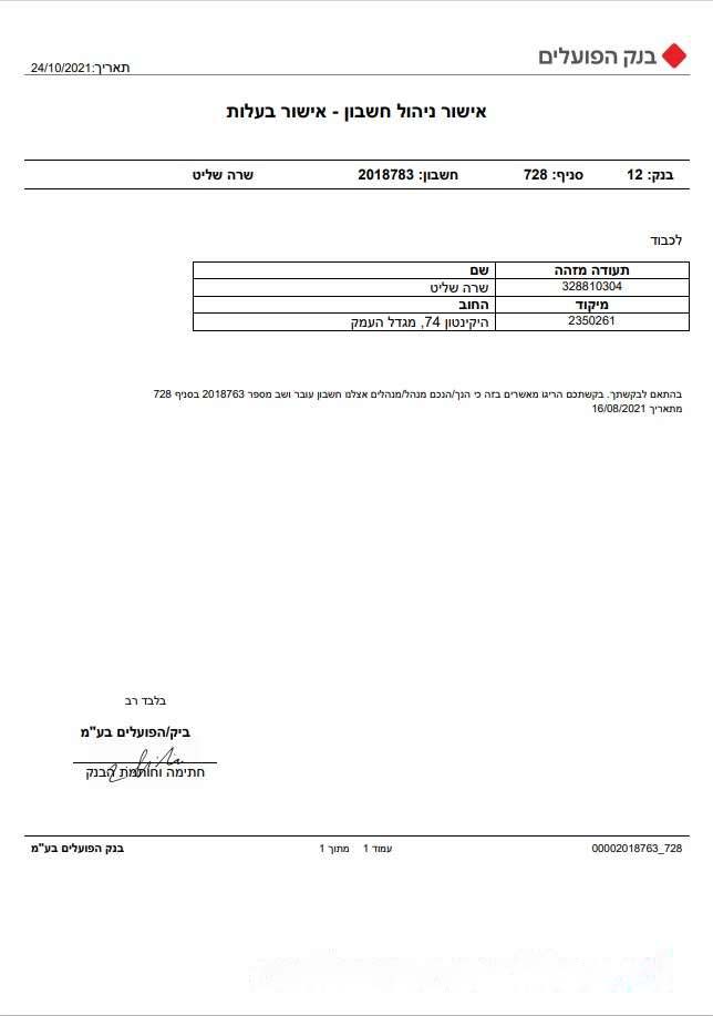 Israel Bank of Hapoalim account management ?C ownership certificate template in Word and PDF format download template file