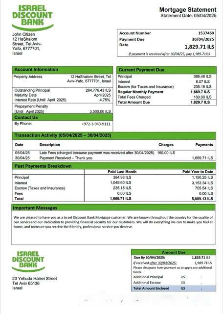 Israel Discount Bank mortgage statement Word and PDF template download template file