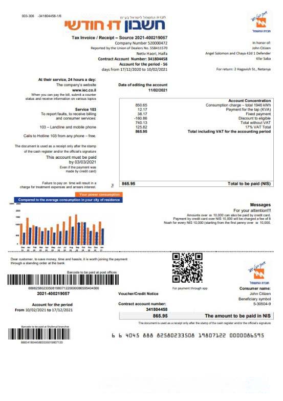 Israel Electric Corporation utility bill template in Word and PDF format (.doc and .pdf), in English download template file