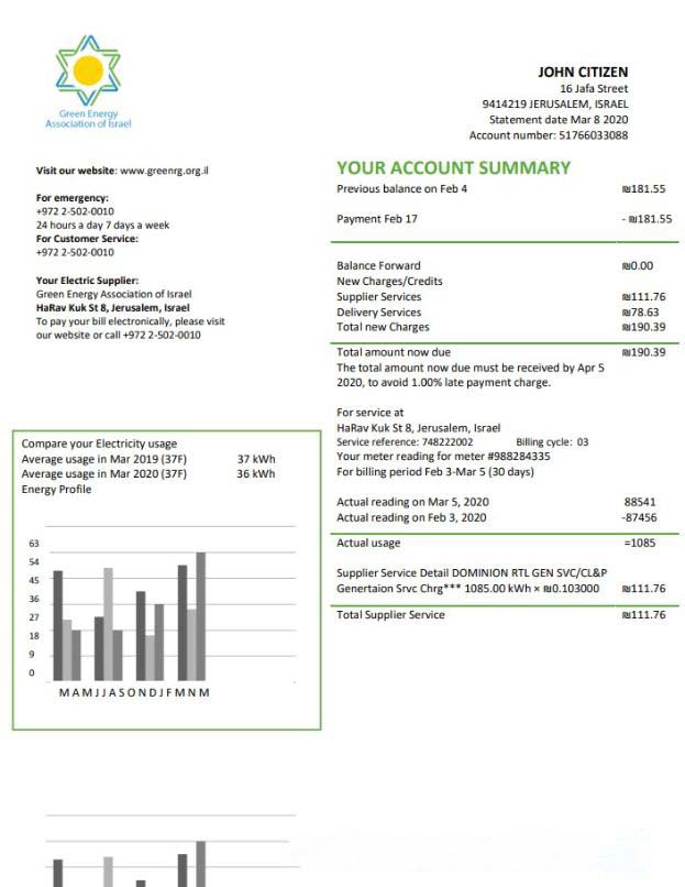 Israel Green Energy Association of Israel utility bill template in Word and PDF format (doc) download template file