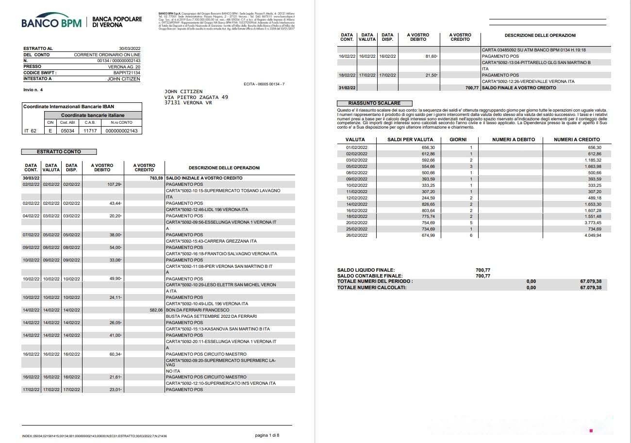 Italy Banco BPM bank statement 8 pages download template file