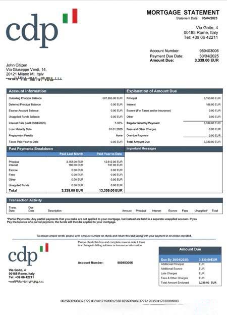 Italy Cassa Depositi e Prestiti mortgage statement Word and PDF template download template file