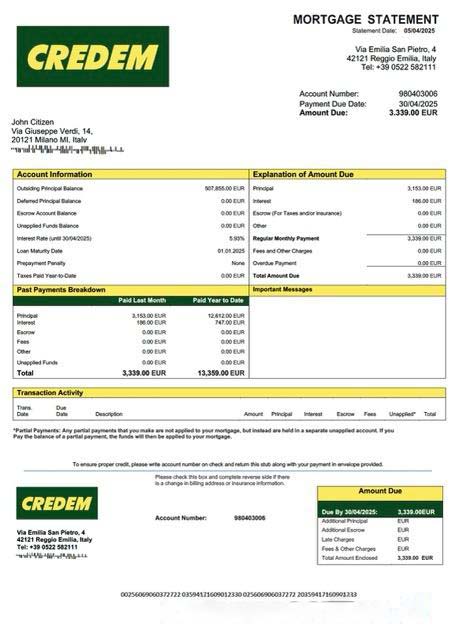 Italy Credito Emiliano mortgage statement Word and PDF template download template file
