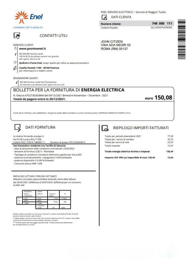 Italy Enel electricity utility bill template in Word and PDF format download template file