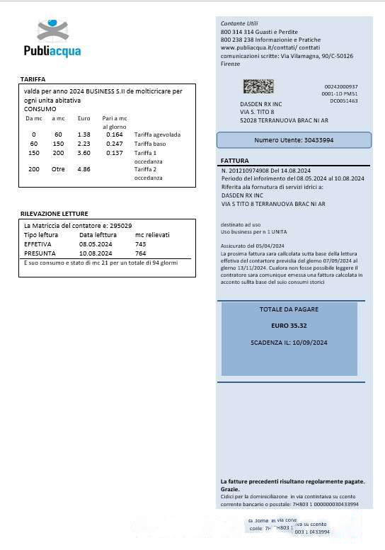 Italy Publiacqua business utility bill template in Word and PDF format download template file