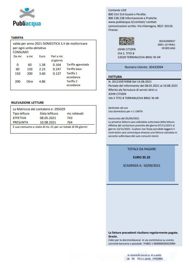 Italy Publiacqua utility bill template in Word and PDF format download template file