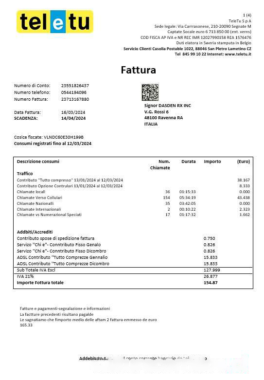 Italy TeleTu business utility bill template in Word and PDF format download template file