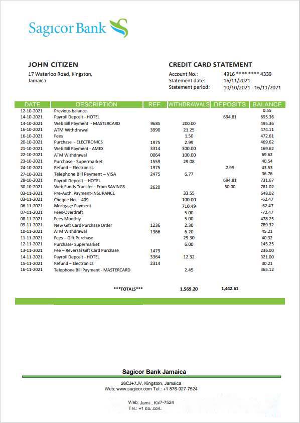 Jamaica Sagicor Bank statement template, Word and PDF format (.doc and .pdf) download template file