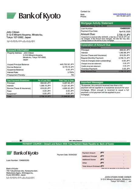 Japan Bank of Kyoto mortgage statement Word and PDF template download template file