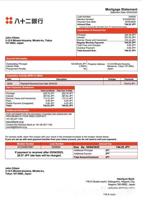 Japan Hachijuni Bank mortgage statement Word and PDF template download template file