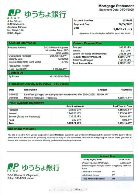 Japan Post Bank mortgage statement Word and PDF template download template file