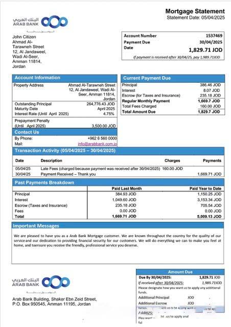 Jordan Arab Bank mortgage statement Word and PDF template download template file