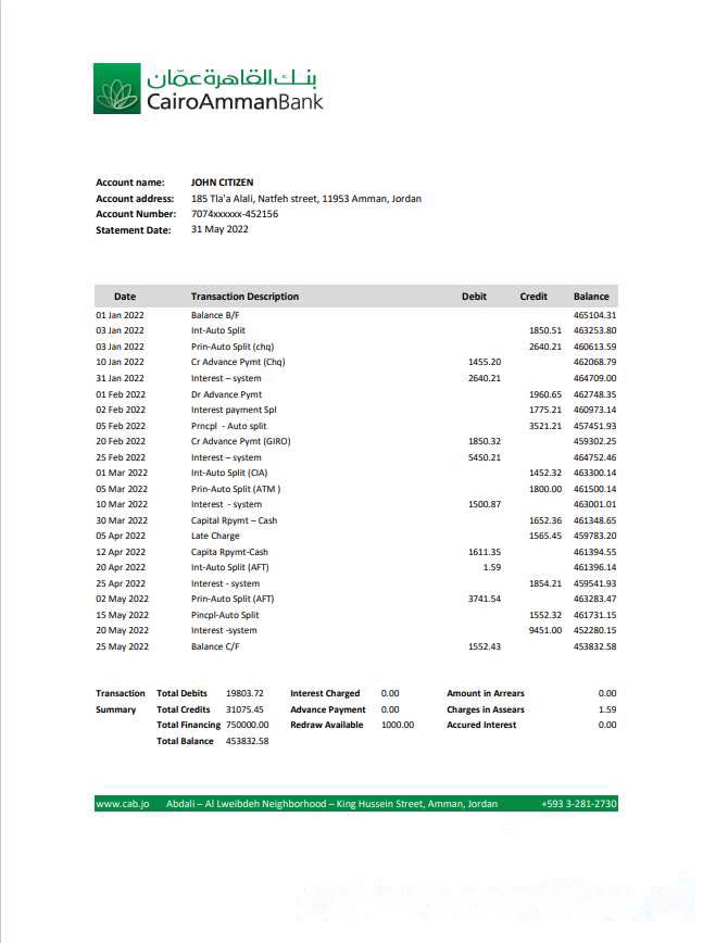Jordan Cairo Amman bank statement template, Excel and PDF format download template file