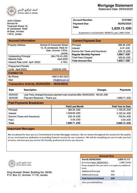 Jordan Central Bank of Jordan mortgage statement Word and PDF template download template file
