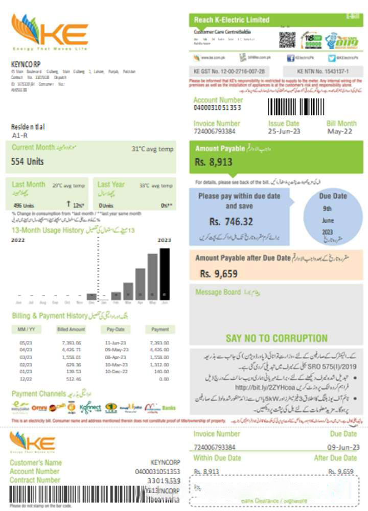 K Electric (KE) electricity utility business bill, page 1, SCR download template file