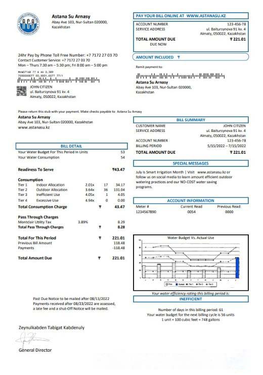 Kazakhstan Astana Su Arnasy utility bill template in Word and PDF format (.doc and .pdf) download template file