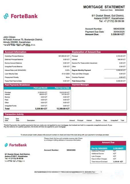 Kazakhstan ForteBank mortgage statement Word and PDF template download template file
