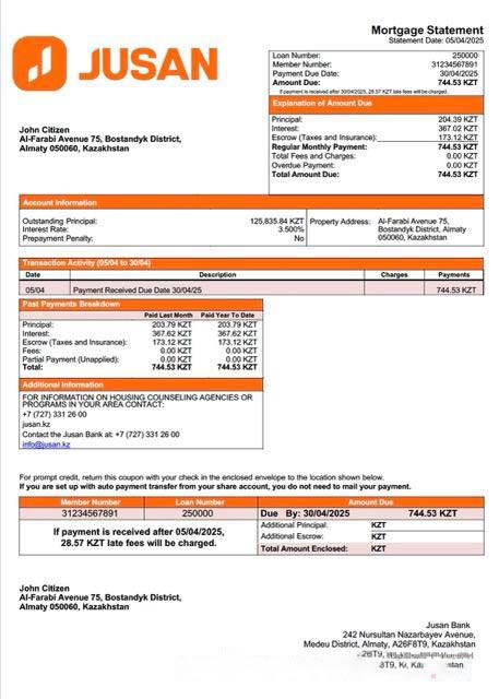 Kazakhstan Jusan Bank mortgage statement Word and PDF template download template file
