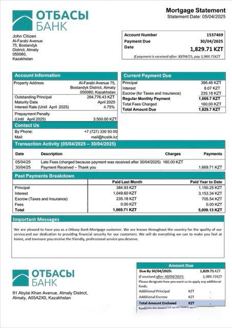 Kazakhstan Otbasy Bank mortgage statement Word and PDF template download template file