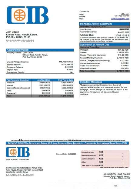 Kenya Commercial International Bank Kenya (CIB) mortgage statement Word and PDF template download template file