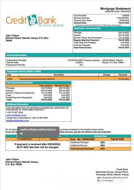 Kenya Credit Bank mortgage statement Word and PDF template download template file