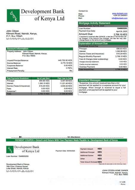 Kenya Development Bank of Kenya mortgage statement Word and PDF template download template file