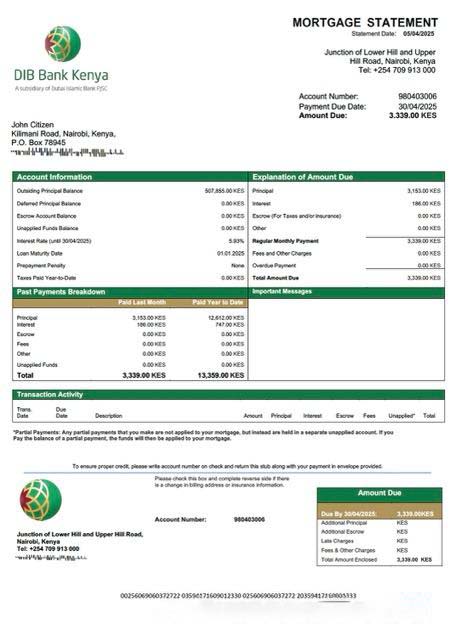 Kenya DIB Bank Kenya mortgage statement Word and PDF template download template file