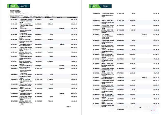 Kenya KCB Bank account statement Word and PDF template, 2 pages download template file