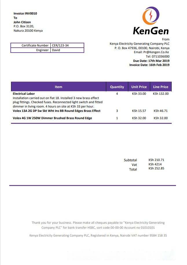 Kenya KenGen Electricity Generating Company utility bill template in Word and PDF format download template file