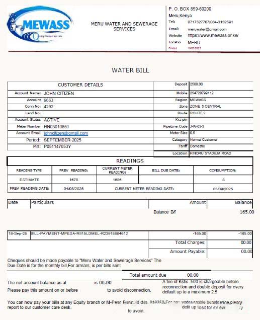 Kenya Meru Water and Sewerage Services utility bill template in Word and PDF formats download template file