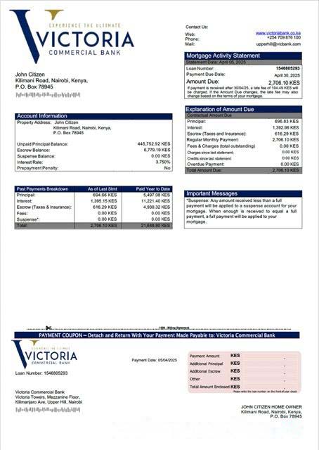 Kenya Victoria Commercial Bank mortgage statement Word and PDF template download template file