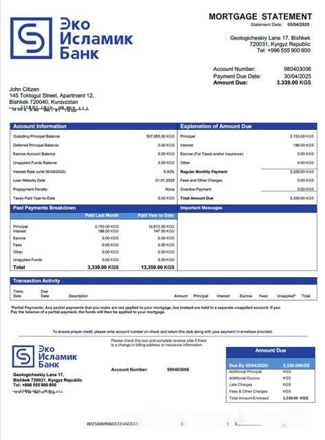 Kyrgyzstan EcoIslamicBank mortgage statement Word and PDF template download template file