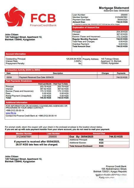 Kyrgyzstan Finance Credit Bank mortgage statement Word and PDF template download template file