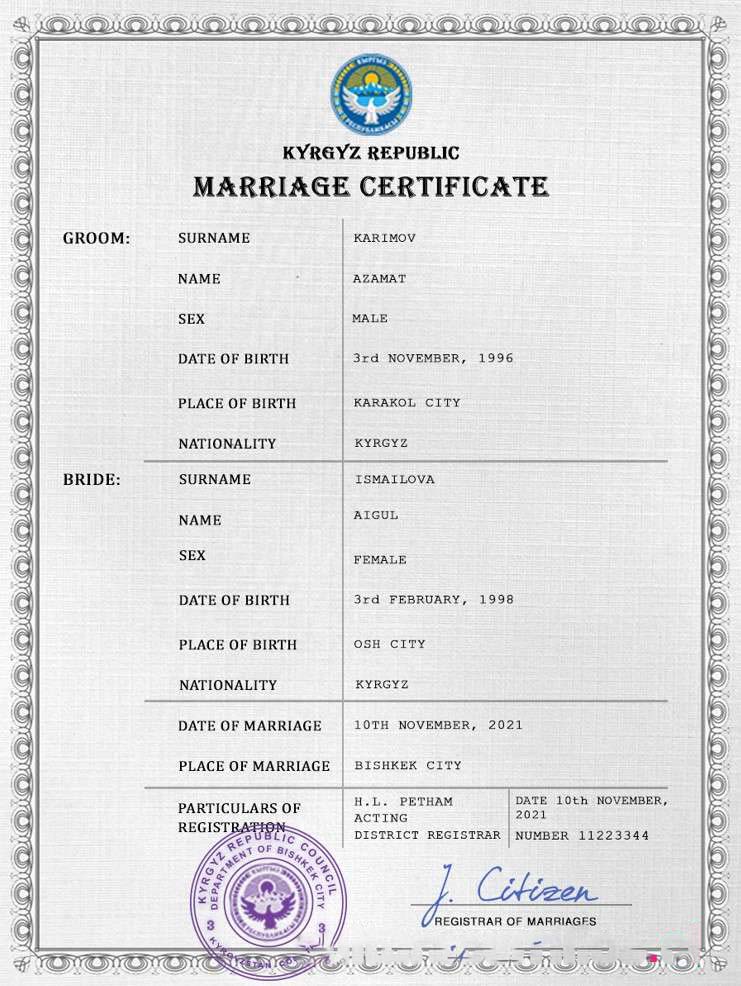 Kyrgyzstan marriage certificate PSD template download template file