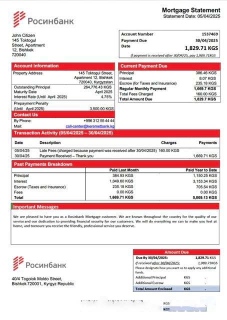 Kyrgyzstan Rosinbank mortgage statement Word and PDF template download template file
