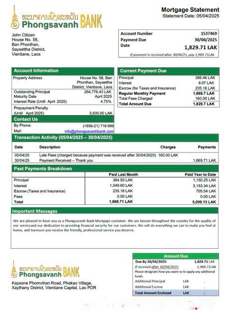 Laos Phongsavanh Bank mortgage statement Word and PDF template download template file