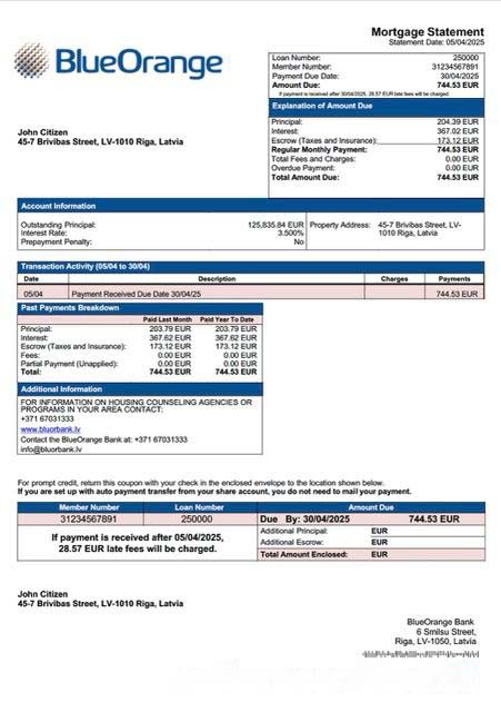 Latvia BlueOrange Bank mortgage statement Word and PDF template download template file