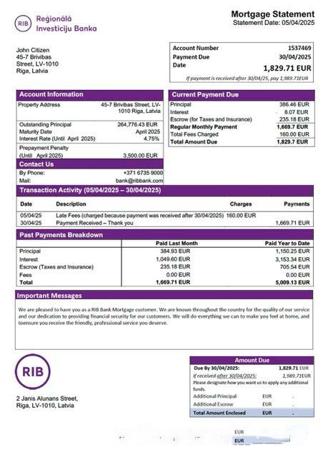 Latvia RIB Bank mortgage statement Word and PDF template download template file