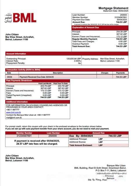 Lebanon Banque Misr Liban mortgage statement Word and PDF template download template file