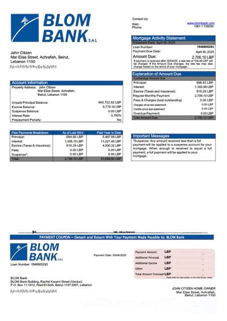 Lebanon BLOM Bank mortgage statement Word and PDF template download template file