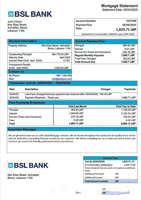 Lebanon BSL Bank mortgage statement Word and PDF template download template file