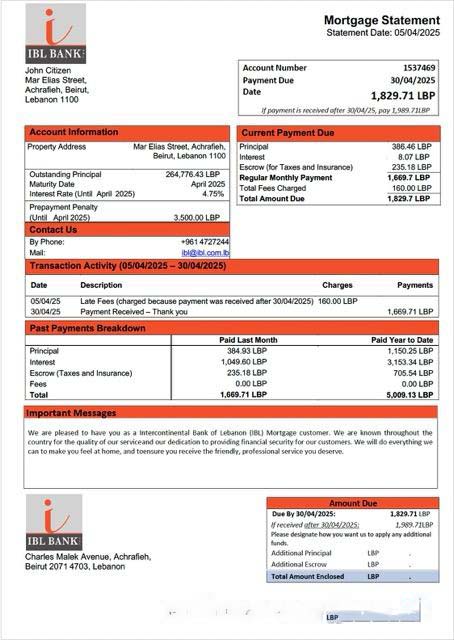 Lebanon Intercontinental Bank of Lebanon (IBL) mortgage statement Word and PDF template download template file