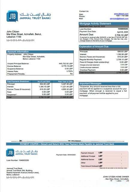 Lebanon Jammal Trust Bank mortgage statement Word and PDF template download template file