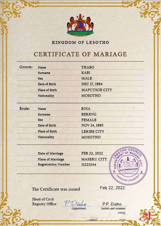 Lesotho marriage certificate PSD template download template file