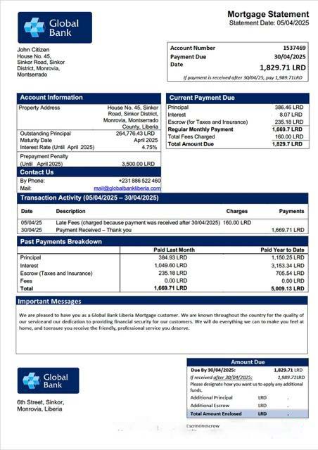 Liberia Global Bank Liberia mortgage statement Word and PDF template download template file