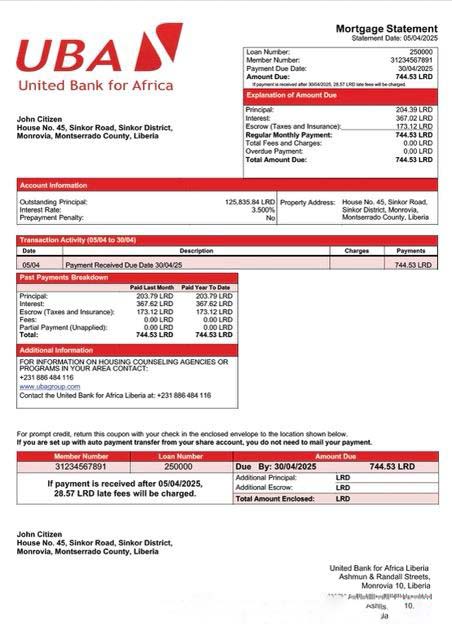 Liberia United Bank for Africa Liberia mortgage statement Word and PDF template download template file