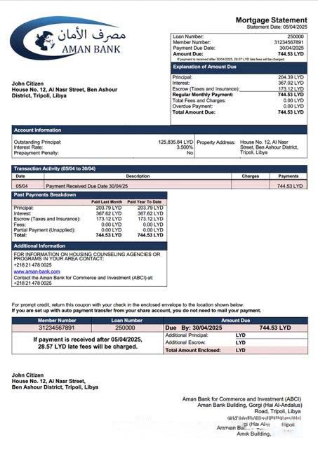 Libya Aman Bank for Commerce and Investment (ABCI) mortgage statement Word and PDF template download template file