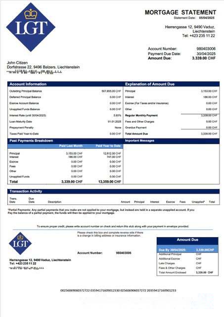 Liechtenstein LGT Bank mortgage statement Word and PDF template download template file