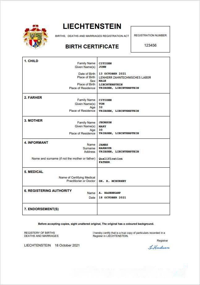 Liechtenstein vital record birth certificate Word and PDF template download template file